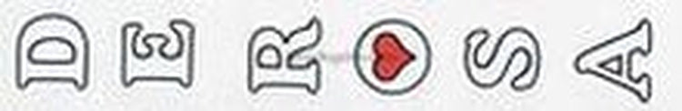 Vertical version of white letters, black edge, red heart. Available in gold also. Unique typeface.