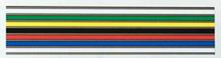 Traditional colours split by black/gold/black separators and with a white band at top and bottom.