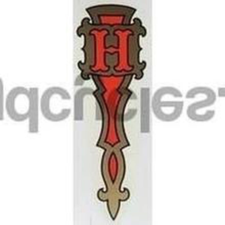 Fancy "H" and embellishments. Red/gold/black. Will not fit forks with long lugs.