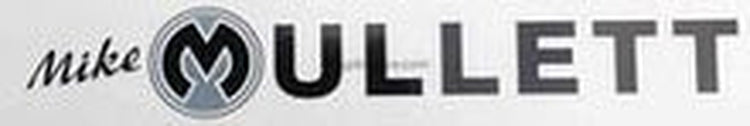 "mike" in script and then "Mullett" with M in silver circle.  Lettering is black with white edge. Also available in red rather than silver.