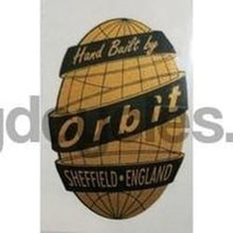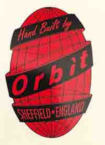 Ovalised globe with "Orbit" across centre. Printed black onto copper colour or red