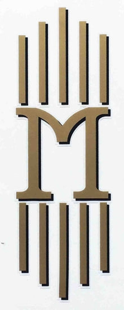 Capital "M" with shorter organ pipes, all in gold with black drop-shadow