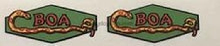 Small hexagon shape with curly snake in red, black and yellow. "Boa" written across the middle. Very colourful and detailed. Please note that these are official, trade-mark approved.