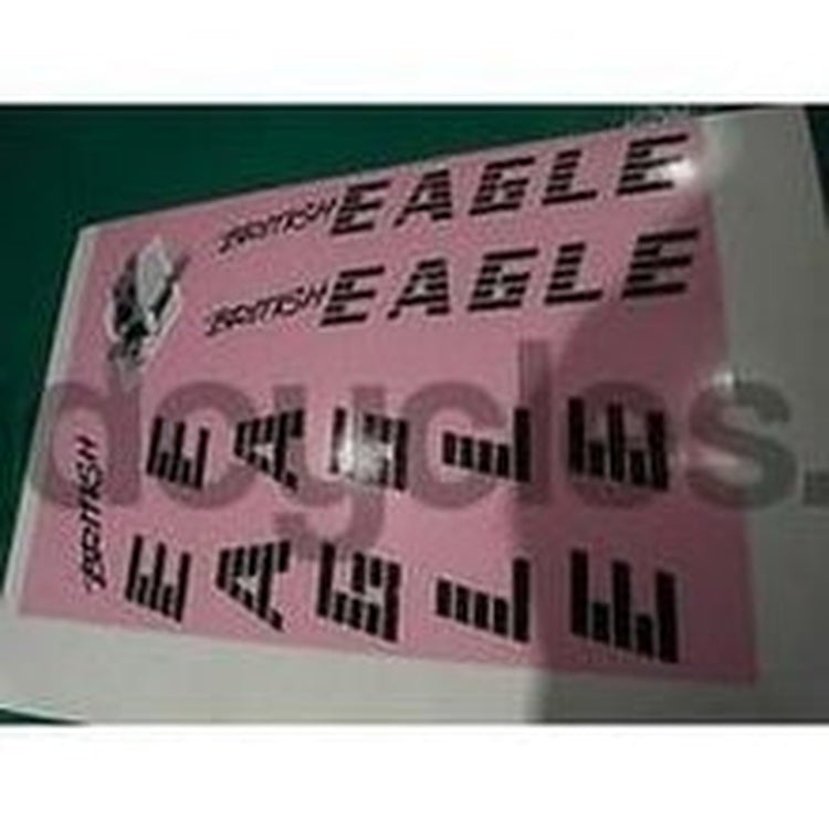 This is a set of British Eagle decals for 1980's frames. The main decals are printed black onto a clear substrate. They are faithfully created from originals in my collection and comprise 2 x downtube, 1 seat tube pair with "British" in script over the top and one head crest with the eagle flying on it. The decals are shown on a pink background for clarity only. Also available in red or white