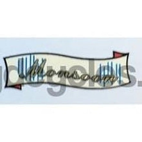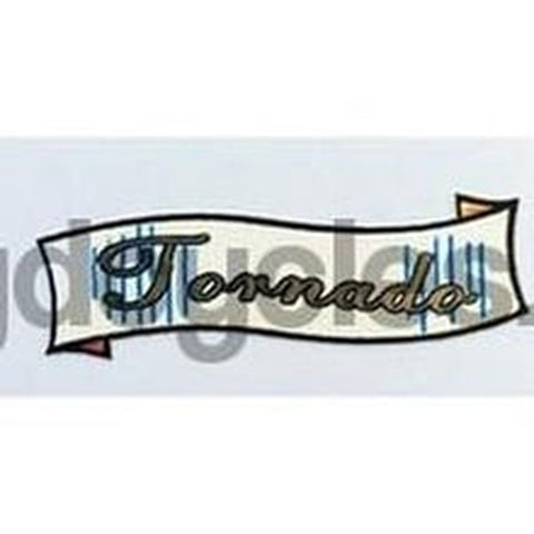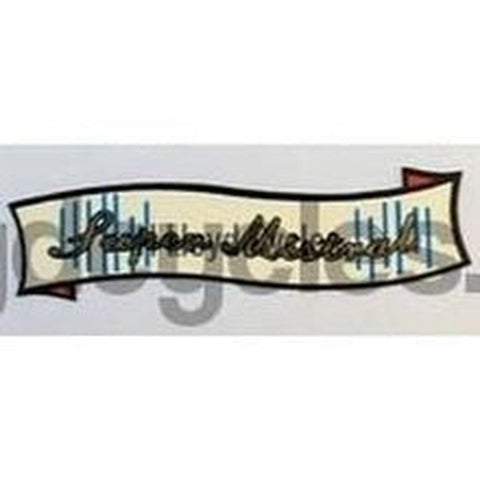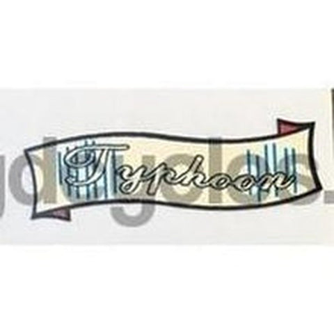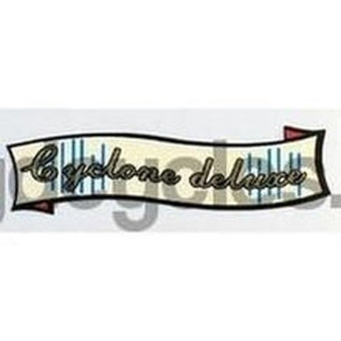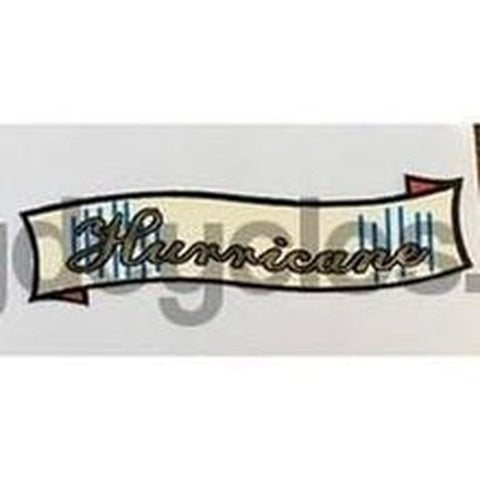 Curved gold script inside small cream "swag". Model name Hurricane, Cyclone, Cyclone Deluxe, Monsoon, Tornado, Whirlwind, Typhoon, Zephyr, Super Mistral, Mistral. PRICED PER PAIR.